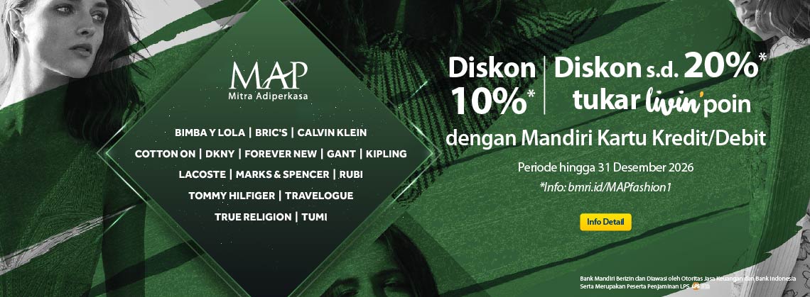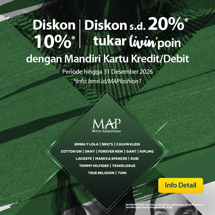 Diskon 10% + Diskon s.d. 20% Tukar Livin'poin dengan Mandiri Kartu Kredit/Debit Diskon 10% + Diskon s.d. 20% T...