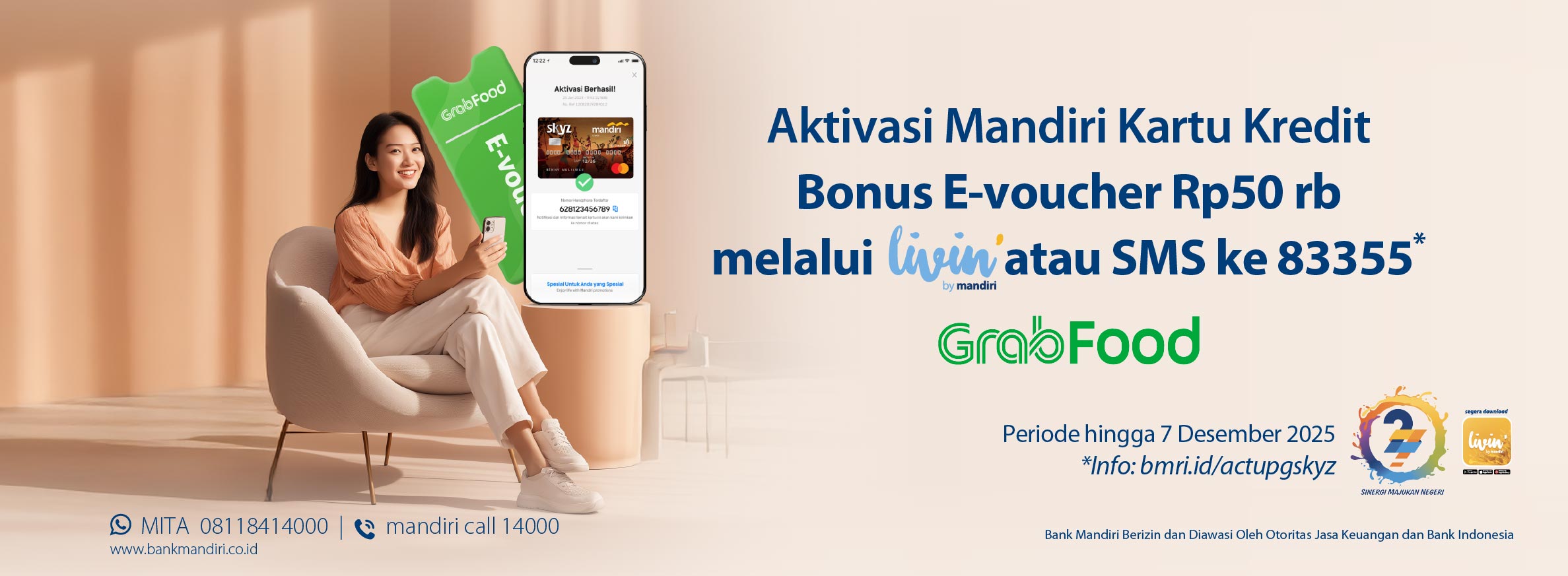 Program Bonus E-Voucher GrabFood Rp50 ribu untuk nasabah yang melakukan aktivasi pada Mandiri Kartu Kredit Skyz yang sudah di upgrade, penawaran khusus kepada nasabah terundang.