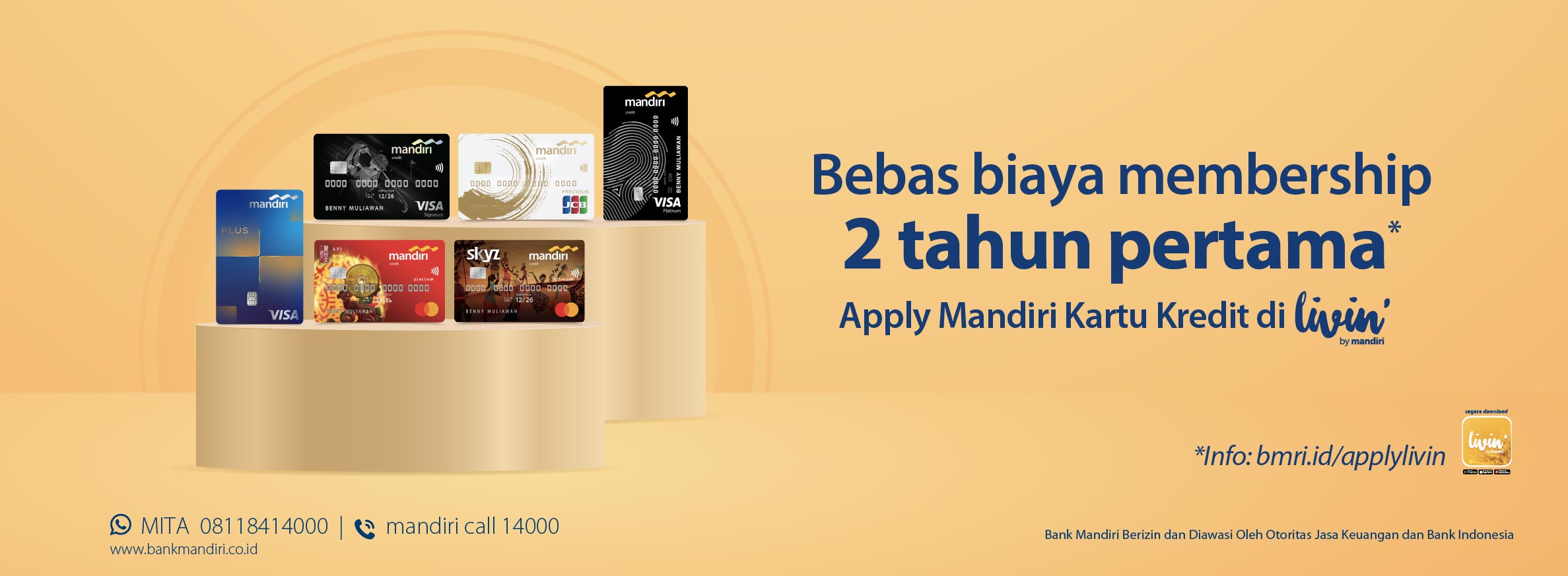 Program penawaran Mandiri Kartu Kredit : Selain itu juga nasabah akan mendapatkan benefit bebas annual fee 2 tahun pertama. Program ini berlaku untuk seluruh jenis Mandiri Kartu Kredit personal (khusus untuk Mandiri Livin’ Everyday Bebas Biaya Membership Kartu seumur hidup). Periode Bebas Biaya Membership Kartu 2 tahun : 1 Januari – 31 Desember 2025 Klik Menu Portofolio Klik Menu Ajukan Kartu Kredit Pilih kartu kredit yang diinginkan, dan isi data pribadi sesuai instruksi Setelah pengisian data kirim pengajuan dengan masukkan PIN Livin’ Pengajuan Kartu Kredit diproses Cashback Rp300 ribu * Hanya berlaku untuk nasabah baru kartu kredit, syarat & ketentuan kunjungi bmri.id/welcomebonus ** Bebas biaya membership kartu 5 tahun pertama tanpa syarat, untuk tahun berikutnya besarnya annual fee mengikuti jenis produk dan ketentuan PT Bank Mandiri (Persero) Tbk. Detail informasi fitur dan benefit produk kunjungi bmri.id/produk. Hubungi 14000