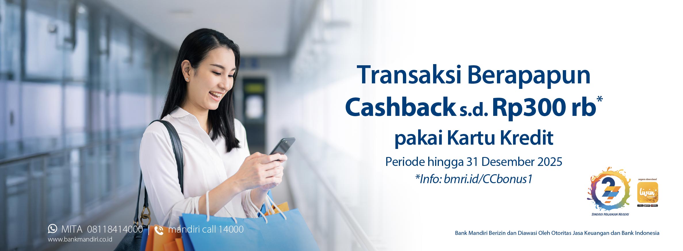 Bonus transaksi pertama adalah penawaran bagi pemegang kartu Mandiri Fengshui/ Mandiri Platinum/ Mandiri Precious (JCB)/Mandiri Shopee Card/Mandiri Traveloka Card untuk melakukan transaksi pertama selama periode program