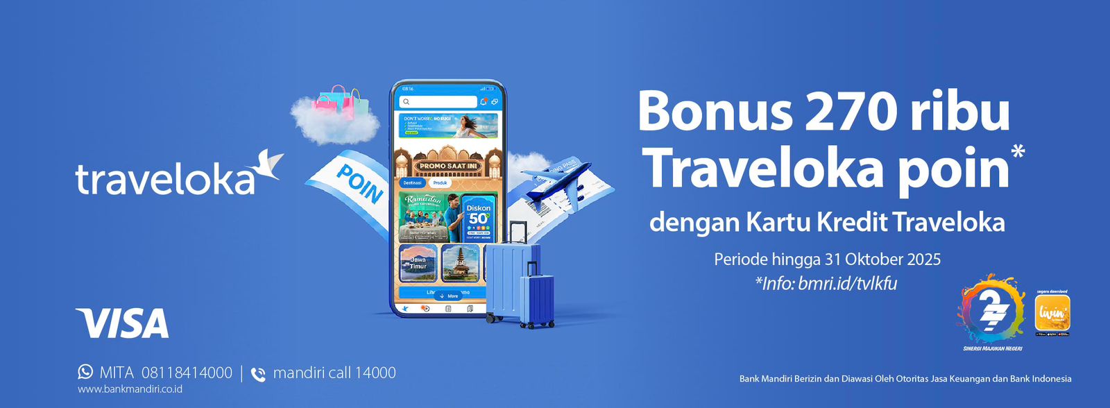 Bonus Traveloka Poin 270 ribu dengan bertransaksi di Aplikasi Traveloka. Penawaran hanya untuk pemegang Mandiri Kartu Kredit Traveloka terpilih yang belum melakukan transaksi pertama pada Mandiri Kartu Kredit Traveloka.