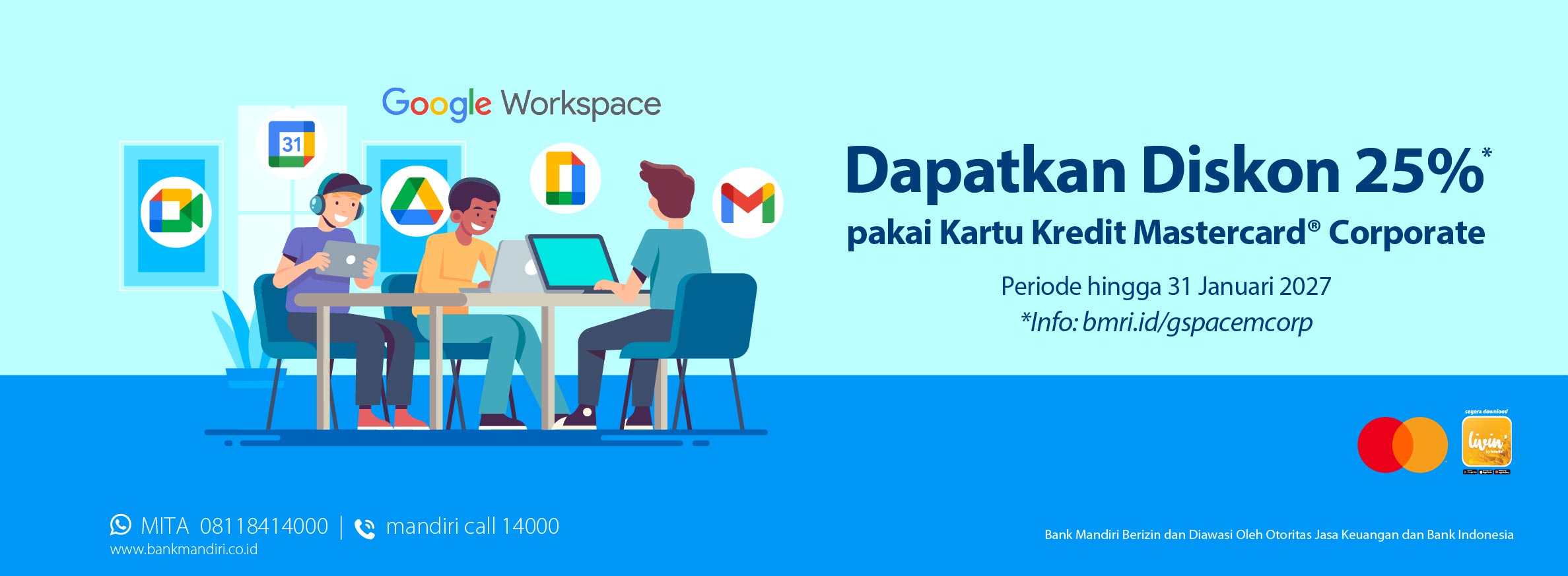 Hemat 25% untuk tahun pertama langganan Standar Bisnis Google Workspace Anda. Dapatkan semua alat yang Anda butuhkan untuk menjalankan dan mengembangkan bisnis Anda dari mana saja. Alat ini meliputi email profesional yang cocok dengan domain Anda, penyimpanan file online untuk segala format, rapat video yang aman, dan lainnya. Program kerjasama ini melalui Mastercard Easy Savings Specials dan berlaku sampai 31 Januari 2027.