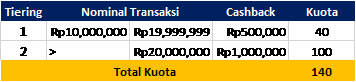 Berlaku Kartu:   Mandiri Fengshui Card, Mandiri Golf Platinum, Mandiri Golf Signature, Mandiri JCB Precious, Mandiri Lippo Malls Card, Mandiri Livin’ Everyday, Mandiri MyPertamina Card, Mandiri Platinum, Mandiri Plus Card, Mandiri Prioritas, Mandiri Signature, Mandiri SKYZ, Mandiri Tzu Chi Card, Mandiri World Elite