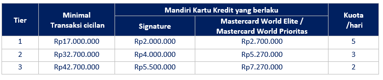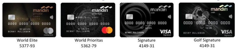 Berlaku Kartu:   Kartu Kredit Pemerintah, Mandiri Duta Bio Energi Card, Mandiri Fengshui Card, Mandiri Golf Platinum, Mandiri Golf Signature, Mandiri HOG Indomobil Jakarta Chapter Card, Mandiri JCB Precious, Mandiri Kartu Kredit Ducati Official Club Indonesia, Mandiri Kartu Kredit HOG Kalimas Solo, Mandiri Kartu Kredit Pemerintah Domestik / Kartu Kredit Indonesia, Mandiri Kartu Kredit Shopee, Mandiri Lippo Malls Card, Mandiri Livin’ Everyday, Mandiri MyPertamina Card, Mandiri Platinum, Mandiri Plus Card, Mandiri Prioritas, Mandiri Signature, Mandiri Signature Buttonscarves, Mandiri SKYZ, Mandiri Traveloka, Mandiri Tzu Chi Card, Mandiri World Elite