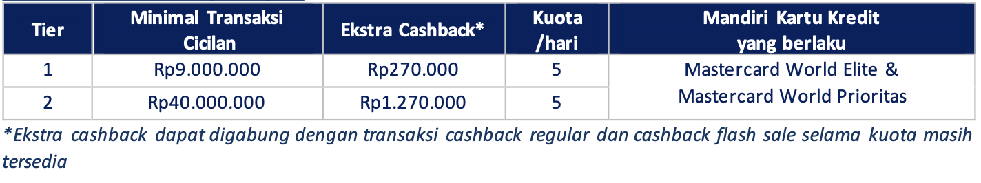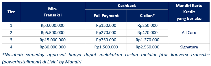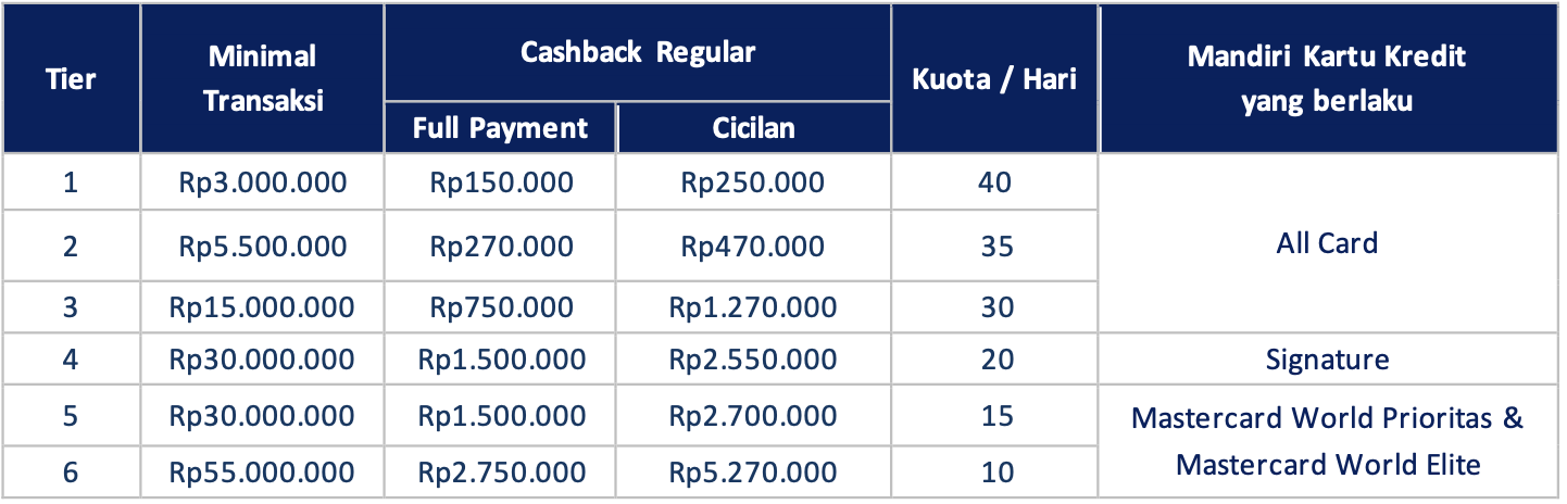 Mandiri Kartu Kredit yang berlaku cashback regular sebagai berikut:
