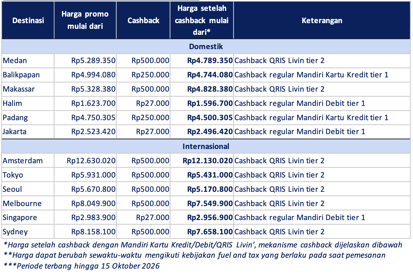 • Program hanya berlaku untuk nasabah yang memiliki Mandiri Debit Co-Brand Garuda Indonesia.