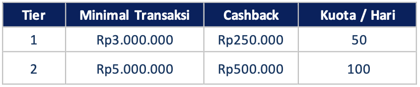 • Nasabah tidak perlu klaim/antri. Cashback akan dikreditkan otomatis ke tagihan kartu (maksimal 3 bulan atau 3 billing tagihan setelah event berakhir).