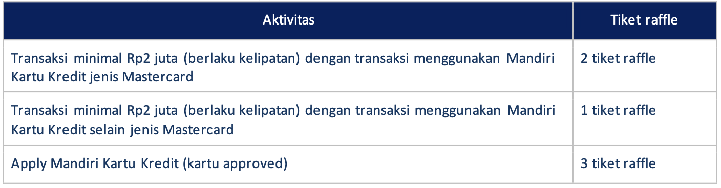 • Maksimal tiket raffle dari aktivitas transaksi sebanyak 10 tiket raffle untuk Mandiri Kartu Kredit selain jenis Mastercard, dan maksimal 20 tiket raffle untuk Mandiri Kartu Kredit jenis Mastercard per hari.