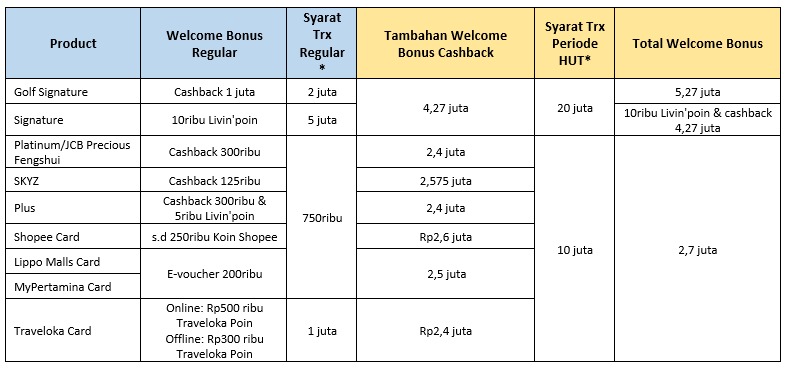 • Welcome bonus hingga Rp5,27 juta berlaku untuk nasabah yang telah mengaktifkan, dan bertransaksi sesuai ketentuan setelah kartu disetujui.