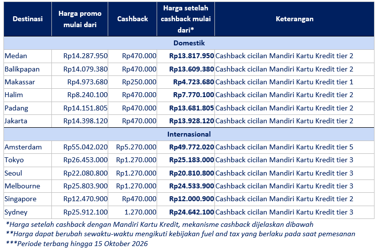 Presale Garuda Indonesia Travel Fair 2025 - Denpasar, Special Fare Tiket Pesawat + Cashback s.d. Rp5,27 juta + Cicilan 0% s.d. 12 bulan dengan Mandiri Kartu Kredit World Elite & World Prioritas
