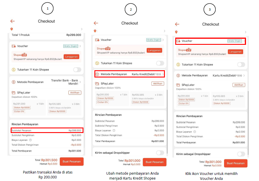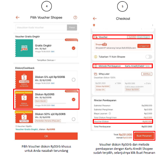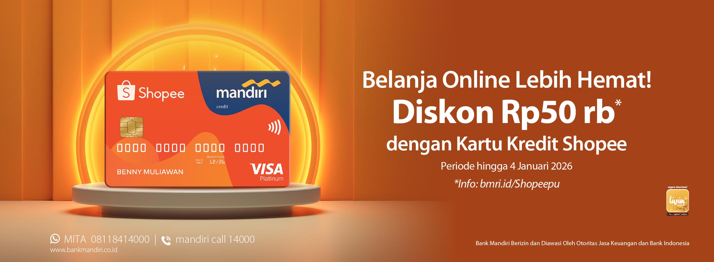 Program kerja sama antara Bank Mandiri dengan Shopee, mengajak nasabah pemegang Mandiri Kartu Kredit Shopee terundang untuk bertransaksi minimal Rp250 ribu, maka dapat menikmati “Diskon Rp50 ribu” selama periode program berlangsung dan kuota voucher masih tersedia.