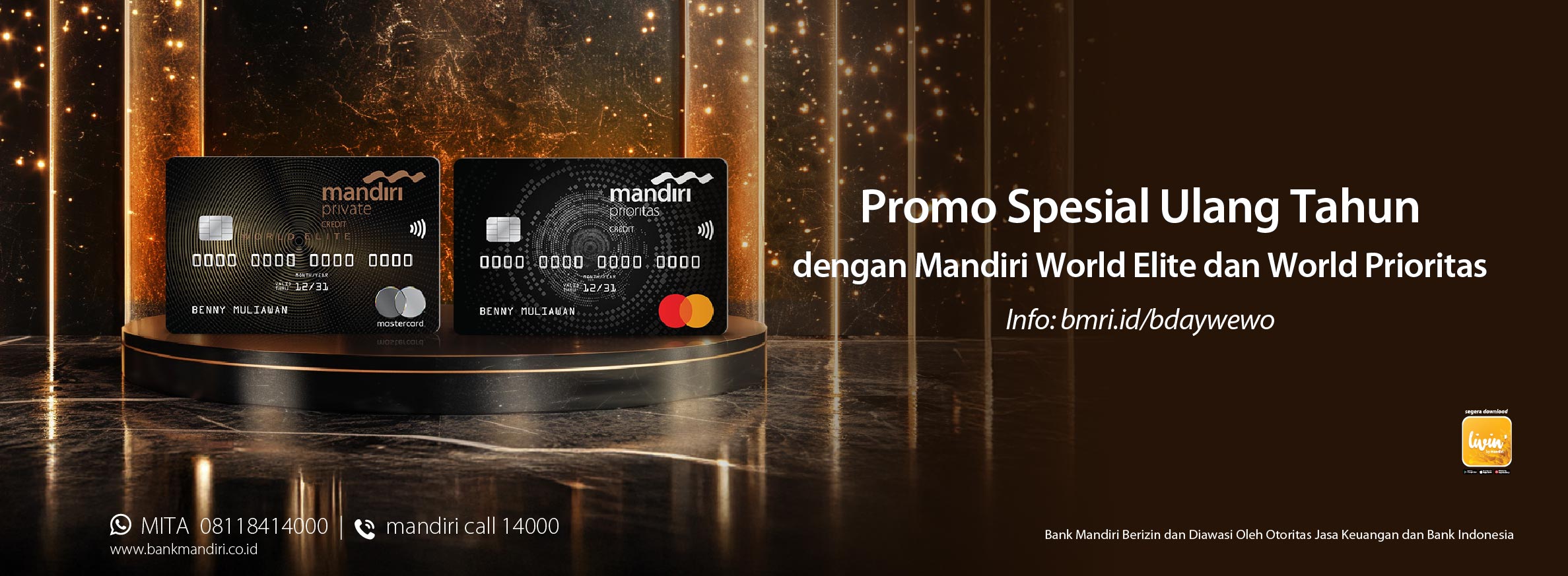 Program Bonus Livin’poin untuk nasabah Private dan Prioritas dengan bertransaksi menggunakan Mandiri Kartu Kredit World Elite dan World. Program berlaku bagi nasabah registrasi mengikuti program.