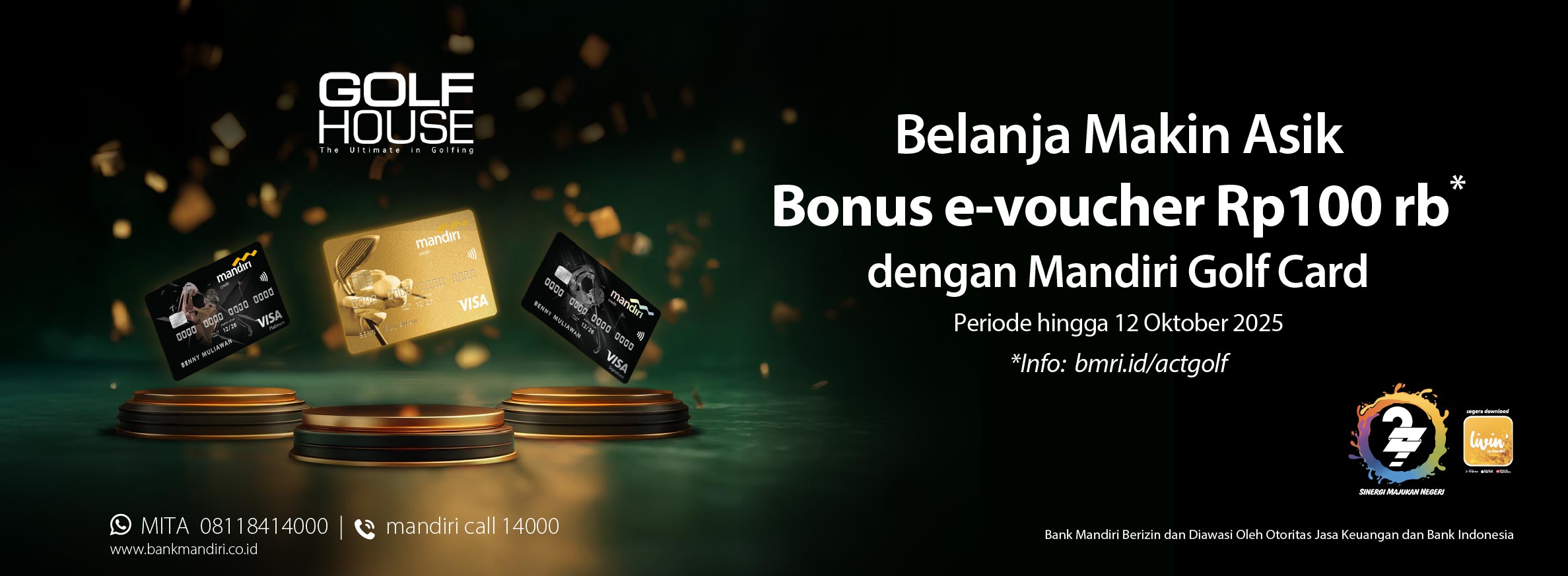Dalam rangka mengajak pemegang Mandiri Kartu Kredit Golf Series untuk meningkatkan transaksi pada kartunya, Bank Mandiri mengadakan program transaksi minimal Rp500 ribu dengan Mandiri Kartu Kredit Golf Series. Bagi nasabah yang memenuhi syarat dan ketentuan program akan mendapatkan bonus e-Voucher Golf House Rp100 ribu, penawaran khusus kepada nasabah terundang program.