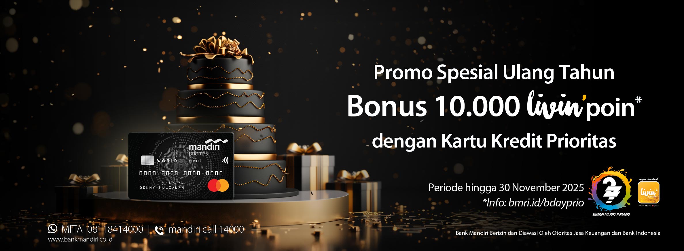 Program bonus 10.000 Livin’poin untuk nasabah prioritas yang berulang tahun dengan bertransaksi menggunakan Mandiri Kartu Kredit World Prioritas. Program berlaku bagi nasabah terundang dan registrasi mengikuti program.