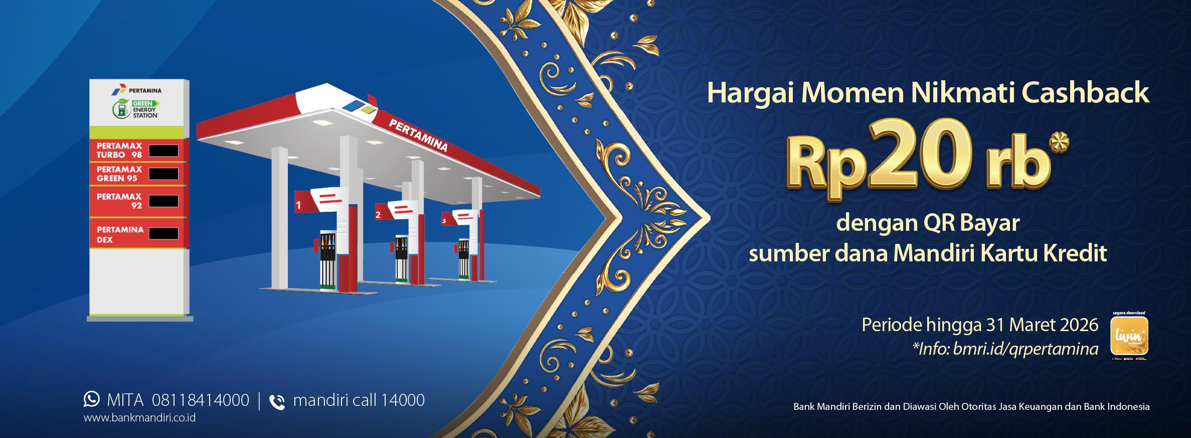 - Nasabah melakukan 1x transaksi minimal Rp150 ribu dengan QR Bayar Livin’ by Mandiri sumber dana Mandiri Kartu Kredit di EDC Bank Mandiri selama periode program berjalan dan kuota tersedia, maka berhak mendapatkan cashback Rp20 ribu