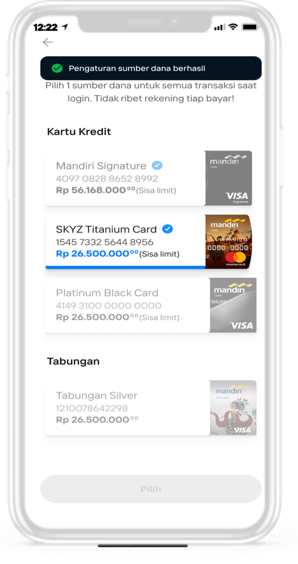 Pilih sumber dana kartu kredit. Kemudian pengaturan QRIS Tap dengan sumber dana kartu kredit berhasil dilakukan